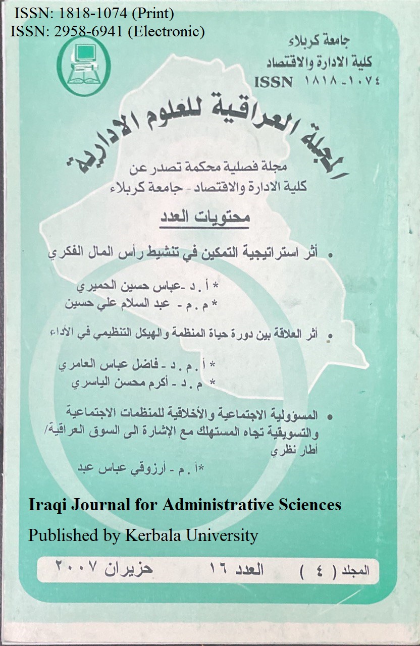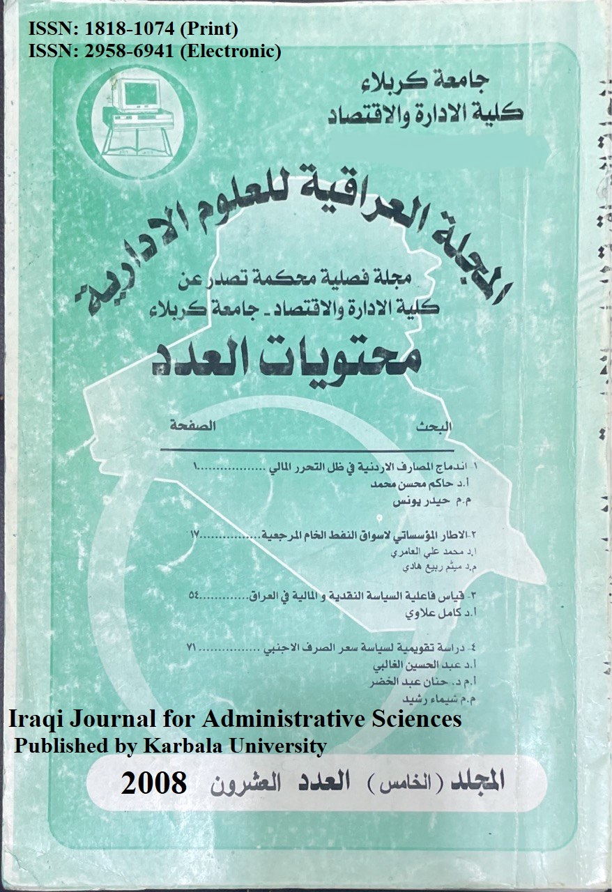 مجلد 5 عدد 20 (2008)تستكشف هذه العناوين موضوعات اقتصادية ومالية وتنظيمية مختلفة تغطي بلدان وقطاعات متعددة. تمت دراسة ديناميكيات اندماج البنوك الأردنية في ضوء التحرير المالي، في حين تم دراسة الإطار المؤسسي لأسواق النفط الخام المرجعية. ويتناول البحث قياس مدى فعالية السياسات النقدية والمالية في العراق، فضلا عن دراسة تقييمية لسياسة سعر الصرف الأجنبي فيه. تم تحليل التفاعل بين الإستراتيجية التنظيمية والهيكل التنظيمي من خلال دراسة ميدانية في المنظمات الأردنية. بالإضافة إلى ذلك، يتم بحث استبدال قطع غيار ماكينات الإنتاج في الشركة العامة للصناعات الكهربائية – مصنع المحركات. يتم دراسة ظاهرة الفساد الإداري على مستوى العالم باستخدام مؤشرات النزاهة وتصورات الفساد. وأخيرا، تم تحليل العلاقة بين التوجه الفردي-الجماعي، وملكية المعرفة العملية، وسلوك المواطنة التنظيمية من خلال دراسة تحليلية، مع تسليط الضوء على الجوانب الإنسانية للديناميكيات التنظيمية.